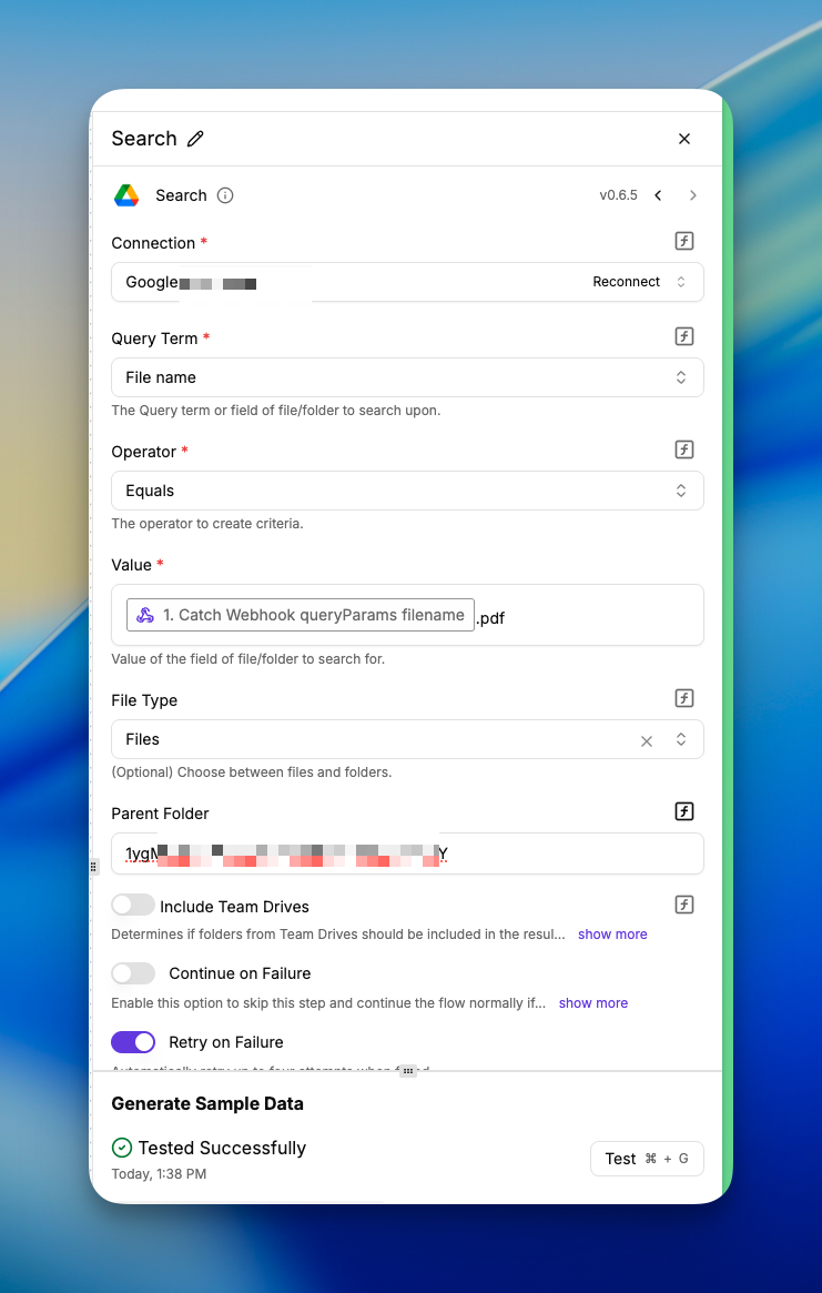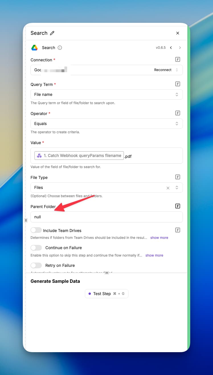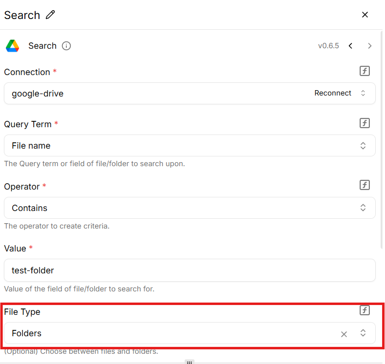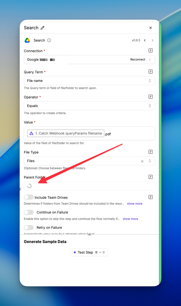 The issue persists , is the same, I cant select Google Drive folder so I have to go with folder ID and now im getting this: Failed to run test step, please ensure settings are correct.
