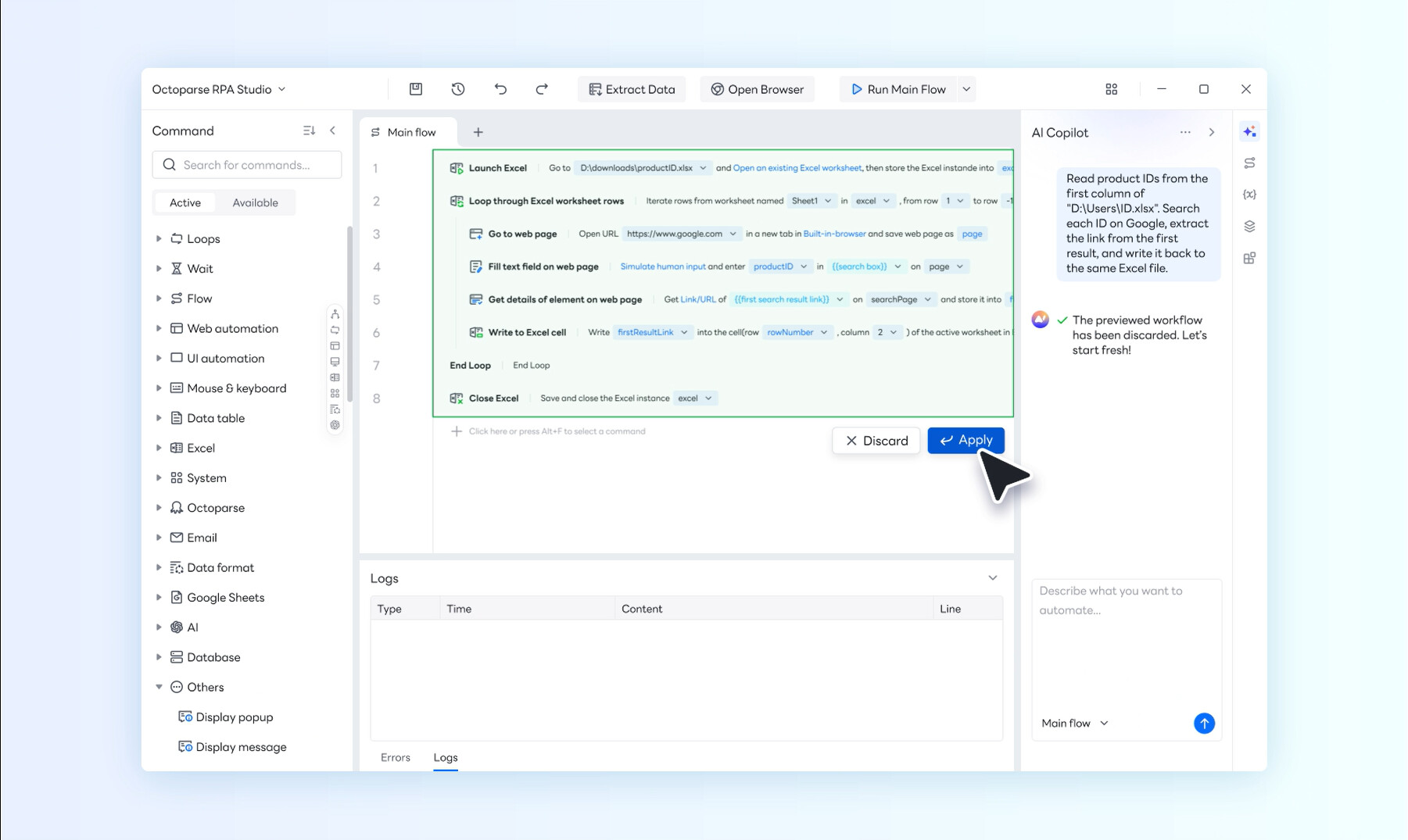 That’s why we started experimenting with Octoparse AI Copilot, an AI-powered RPA tool that turns plain language into runnable workflows.