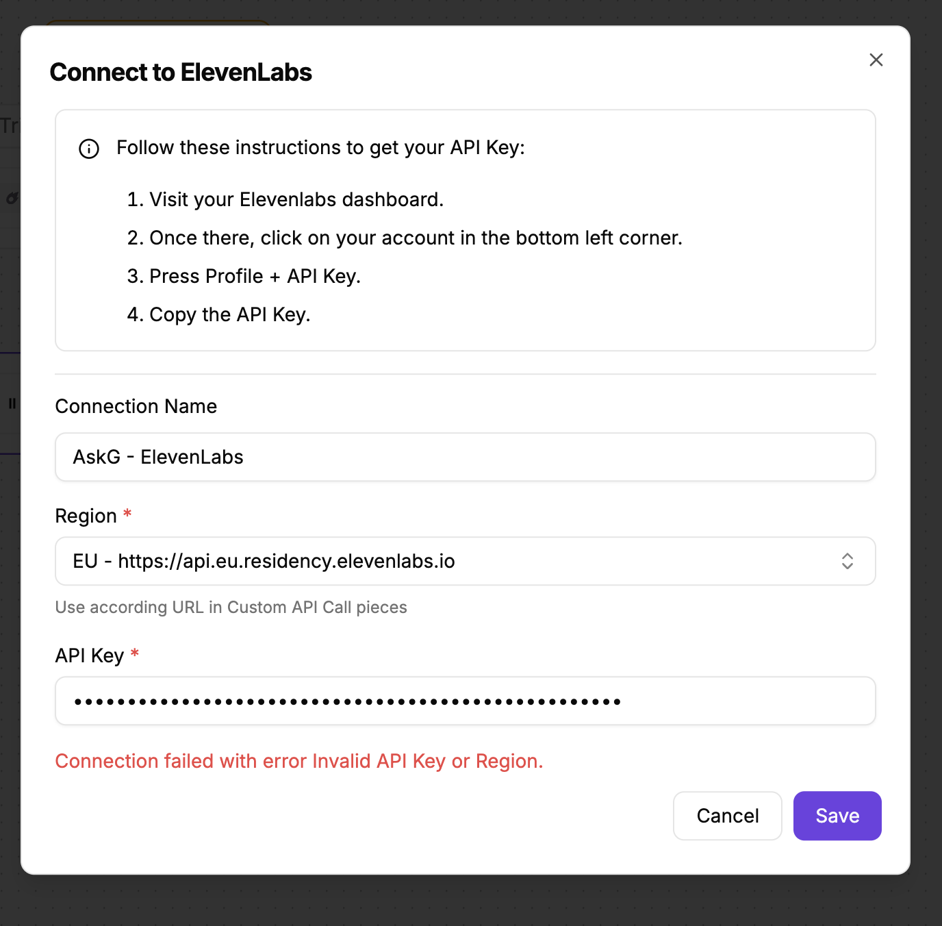 However, when I enter the API Key and select the appropriate region (EU - https://api.eu.residency.elevenlabs.io), I get the following error message: