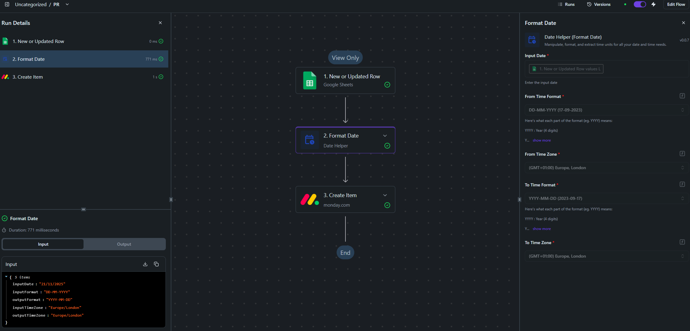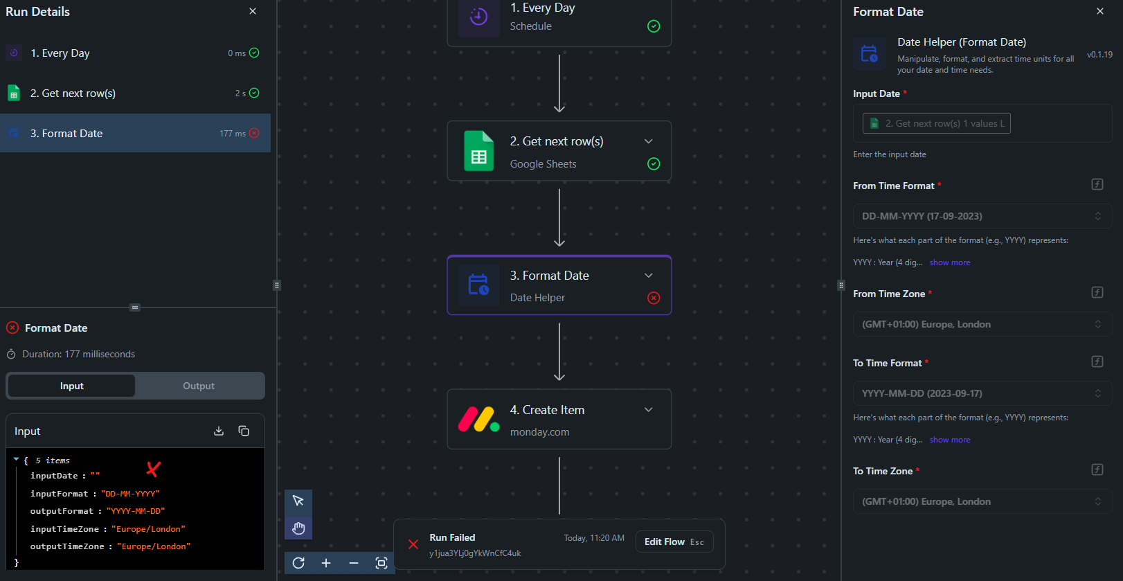 - The sheet is formatted DD/MM/YYYY. Via Format Date, I have tried DD/MM/YYYY and DD-MM-YYYY to YYYY-MM-DD in Active Pieces (as this is the format Monday.com’s API requires). When I test the Format Date step, the generated sample data shows the DD/MM/YYYY date in ‘inputDate’, but when I test the full flow, inputDate displays as “” instead: