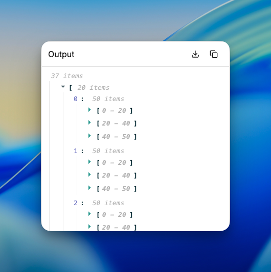 - Code Piece (Chunker): I use the following code to split the array into chunks of 50: