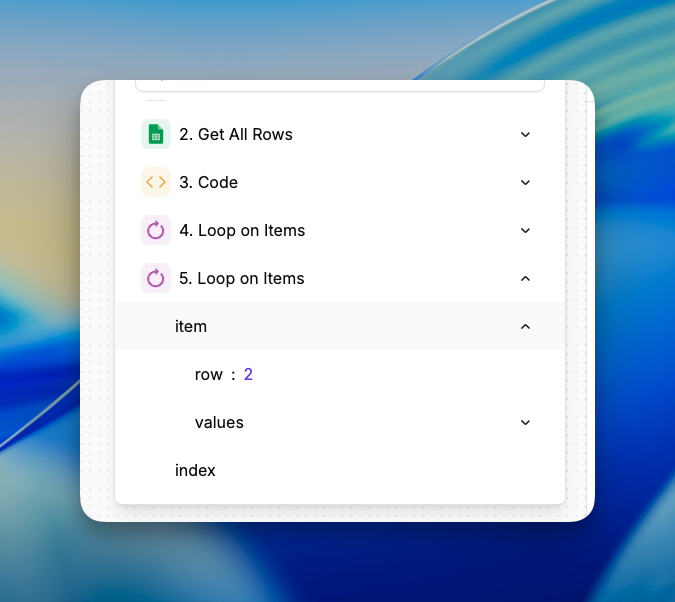 - Mapping to “Update Multiple Rows”: How can I fulfill my goal of updating blocks of 50 rows at once? Even if the nested loop finishes, the “Update Multiple Rows” action doesn’t let me select the array of results from the inner loop iterations in the data picker.