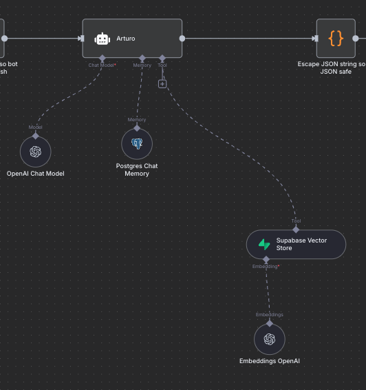 - Uses a vector store (Supabase) with OpenAI embeddings to provide business-specific knowledge as a tool to the agent
