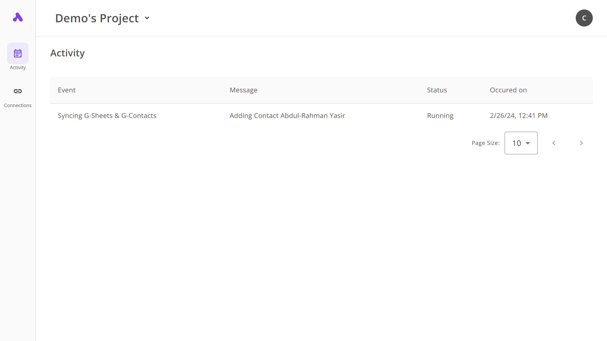 , we created a table where customers can track their automations at any time they want, providing them with essential information in 4 columns (Event, Message, Status and Occurred on).