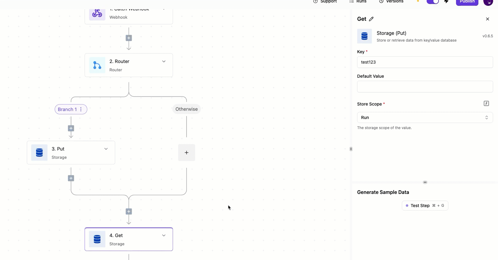When i use storage Put in a branch of Router and retrieve it using storage Get after the router (outside). I can’t get the data out. Test step just give undefined. This only happen to Run scope in router.