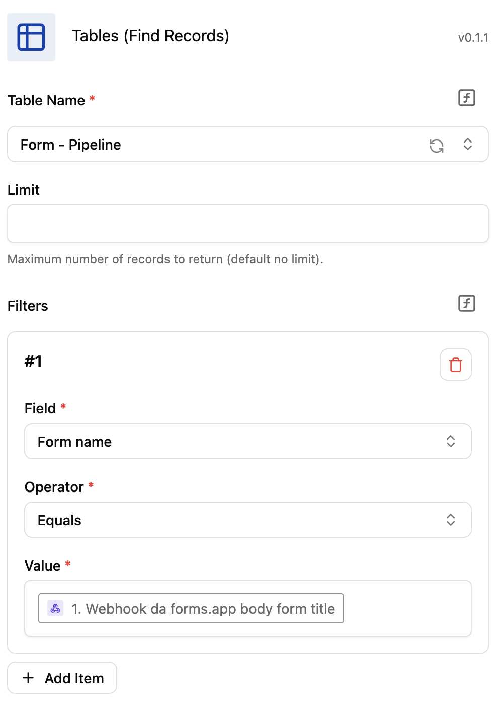 I added a piece, “Tables (Find Records)”, which at the time of writing is at version 0.1.1. I used a filter to find all the records that matches the form name.