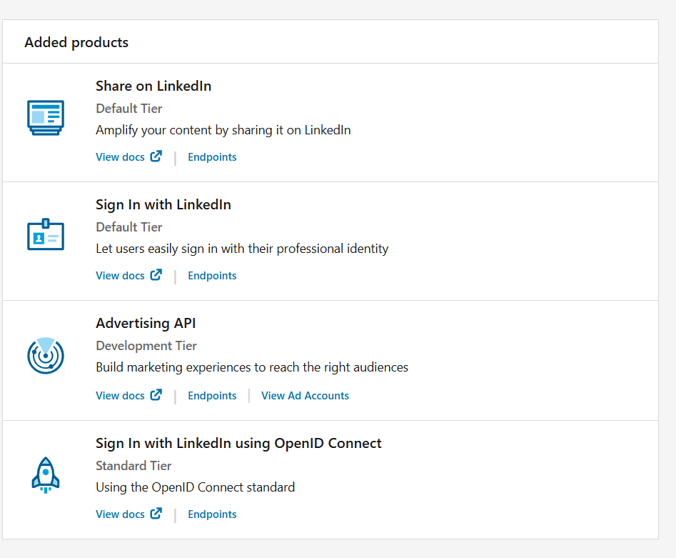 I have checked our cloud LinkedIn app products, as shown in the image. You can add the same to work with actions since ‘Share on LinkedIn’ includes all the necessary endpoints required for the current actions.